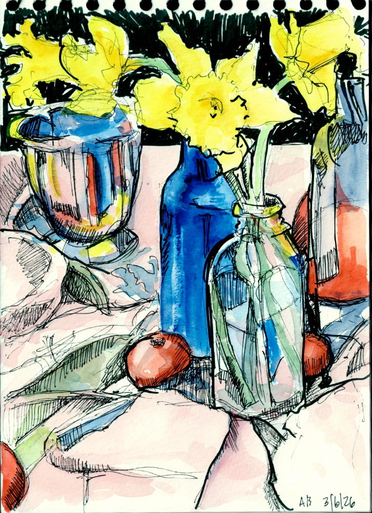 In joining the local Sketchers group, I made the decision that not all my hours of art making need to be billable hours. I love following the writers and artists here who share their sketchbooks ( Sue Clancy Amy Stewart Wendy Wolf Lorene Edwards Forkner among others). A sketchbook, at least to me, is a more personal, not exactly private, but to be shared with a select audience. It’s more this is where I was; this is what I’m thinking and feeling; I was HERE; than I made this thing and you should buy it.